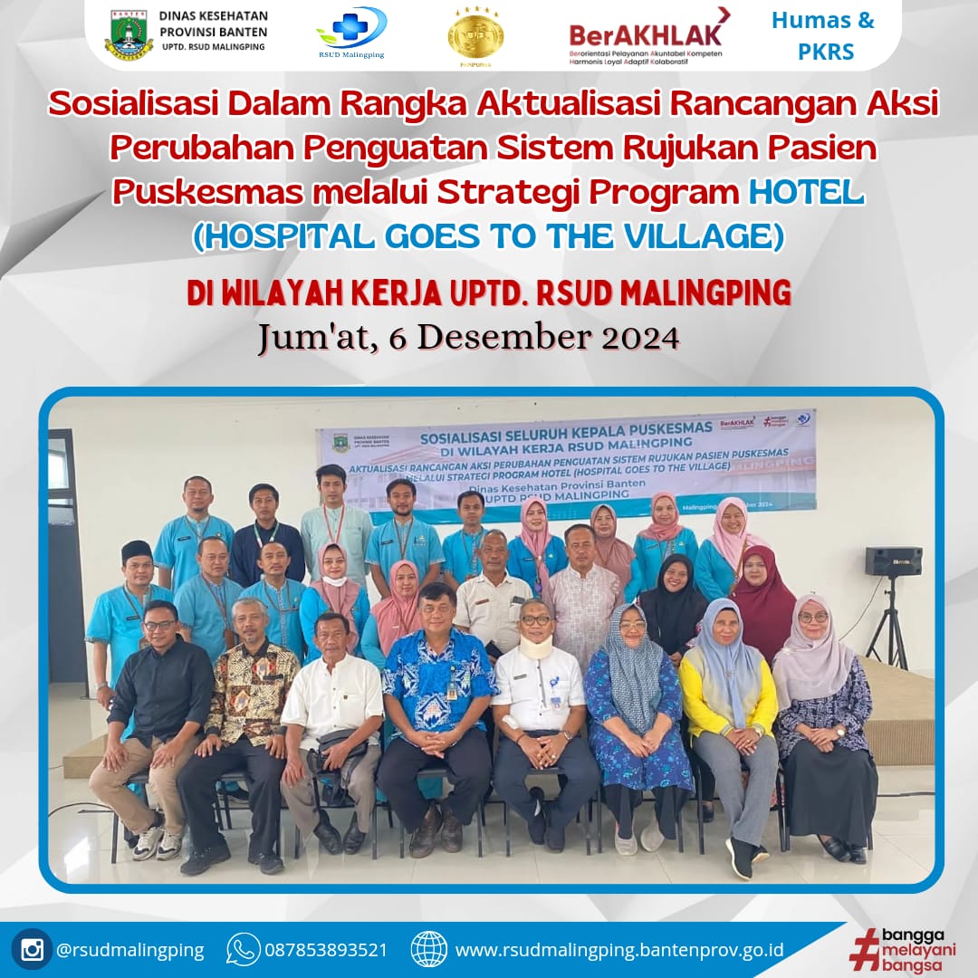Pada hari Jum’at tanggal 06 Desember 2024 jam 13.00 WIB bertempat di Auditorium lantai 3 UPTD RSUD Malingping telah dilaksanakan kegiatan Sosialisasi kepada seluruh Kepala Puskesmas yang berada di wilayah kerja RSUD Malingping dalam rangka Aktualisasi Rancangan Aksi Perubahan penguatan Sistem Rujukan Pasien Puskesmas melalui strategi program HOTEL (Hospital goes to the Village).